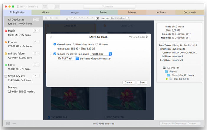 - 通过整理,您可以通过所有者应用程序、内容、类型、创建者、扩展、修改时间、创建的时间、名称、标签、可见性和日期/年龄来搜索重复的文件和包。你也可以通过标签,持续时间,以及MP3和AAC音频文件和EXIF元数据进行搜索;搜索照片、iPhoto、孔径、- – iTunes、iPod数据库和邮箱邮箱的内容;并与iPhoto, Mail和iTunes同步删除。