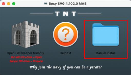 ➡️ 双击打开上面的DMG文件,出现下面的窗口,点击Manual按钮进入Manual install文件夹下,里面有Boxy SVG 4.102.0 MAS[TNT].dmg文件。